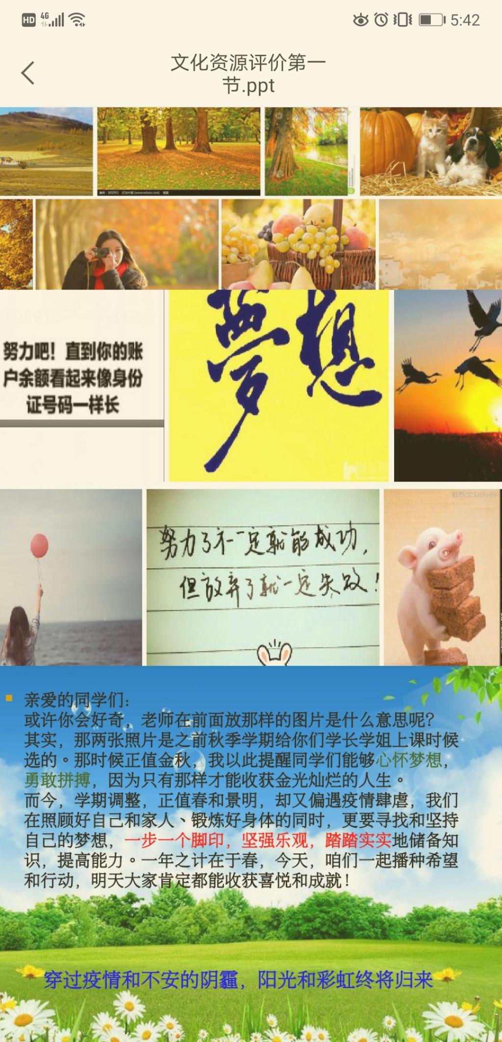 疫情期间,网络上不时传出关于网课的各种段子,调侃之余,也让人思考如何让学生以积极健康的心态接受网课,上好网课。为此,文管系的老师在网课第一课中首先做好学生的心理疏导,刘双老师的课程第一张PPT,是封短信,鼓励同学们“照顾好自己和家人,锻炼好身体的同时,更要寻找和坚持自己的梦想”,“穿过疫情和不安的阴霾,阳光和彩虹终将归来”;李海霞老师则直接把苏轼的词“万里归来颜愈少,微笑,笑时犹带岭梅香。试问岭南应不好,却道:此心安处是吾乡。”直接作为课程封面,希望同学们不管身在何处,都能保持良好的心态,每次上课之前,先整理心情,再进行学习。