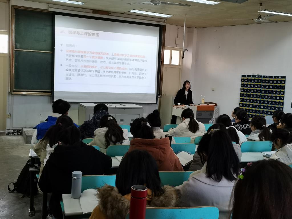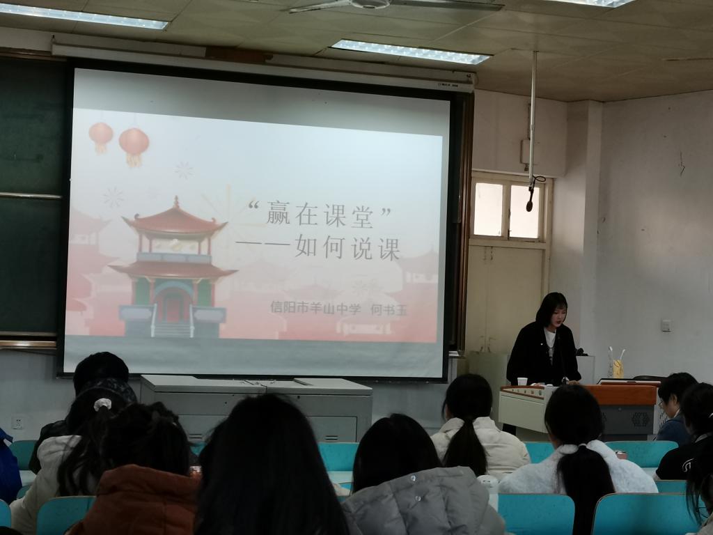 12月2日上午,应我院邀请,信阳市羊山中学教师何书玉莅临我院,为我院师范生作题为《赢在课堂—如何说课》的教学讲座。讲座由太阳成集团122ccvip副院长孙炜主持,我院2019级师范生和学科教学研究生到场聆听了此次讲座。