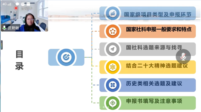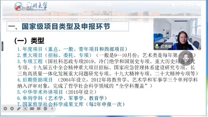 武艳敏教授首先介绍了国家级项目类型及申报环节,指出只有熟悉各类项目特点及申报流程才能做到事半功倍;接着,武教授就我院教师国家社科基金项目的选题来源给出了新思路,她建议老师们要认真研习二十大报告精神,结合自身研究方向,选择符合 “现代化”背景的课题;最后,武教授就国社科申报书的填写及注意事项给出了建设性的指导。