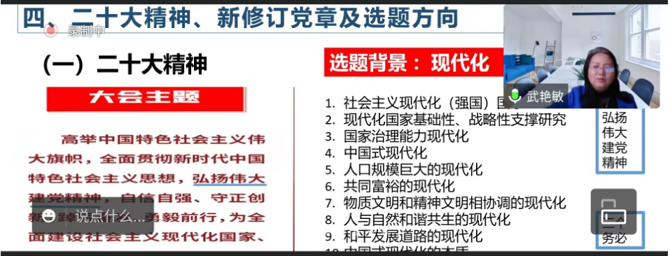武艳敏教授的报告为我院师生学习二十大报告精神和申报国家级项目选题的来源打开了新思路。身为哲学社会科学工作者我们应立足自身学术背景,为实现社会主义现代化强国的战略要求,从不同学科、不同领域为党和国家大局服务,为繁荣哲学社会科学服务。