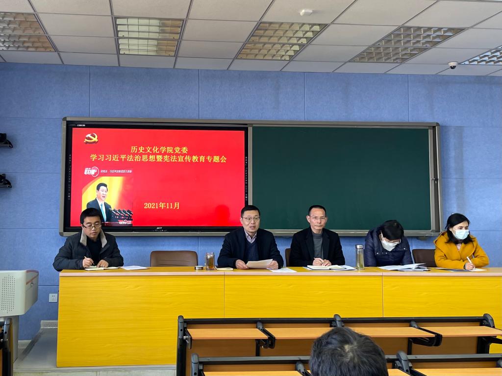 值我国第四个宪法宣传周来临之际,11月30日下午,历史文化学院党委组织召开学习习近平法治思想暨宪法宣传教育专题会。学院党委班子成员及全体教职工、学生代表参加会议。
