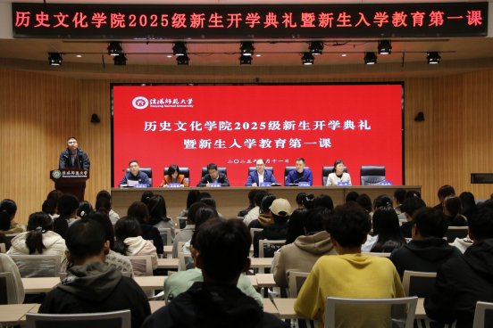开学典礼在庄严的国歌声中拉开帷幕。新生代表学科教学(历史)专业研究生赵慧同学发言,她结合自身从本科生到研究生的身份转变,分享了对历史学习的思考,以青春热忱诠释了新一代历史学子对学术与使命的担当。2023级历史学专业本科生杨晅沂代表在校生发言,她结合自身在学院的成长历程,分享了“从课堂到实践,从知识到素养”的感悟。教师代表张乐锋博士从学科视角出发,激励新生们以严谨的态度探索历史世界,在专业学习中培养批判性思维与人文情怀。我院2004级首届历史学专业校友化世太博士作为优秀校友代表发言,他结合自身从信师学子到高校教师的成长轨迹,回顾了在校求学时的难忘岁月,并分享了专业深耕与职业发展的宝贵经验。