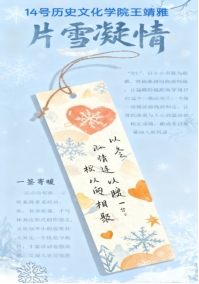 此次活动为同学们搭建了情感表达与才华展示的平台,拉近了师生及同窗间的距离,营造了温馨的校园氛围。未来,学院将继续推出更多有温度、有内涵的文化活动,丰富校园文化生活。冬雪覆阶凝雅韵,书签载意传温情。近日,我院“片雪凝情,一签寄暖”书签活动圆满完成全部环节,在墨香与雪韵的交融中温情落幕。这场以雪为媒、以签为载体的文化盛宴,将冬日的清寂与人心的温热相融,为学院冬日文化生活注入了别样的诗意与暖意。