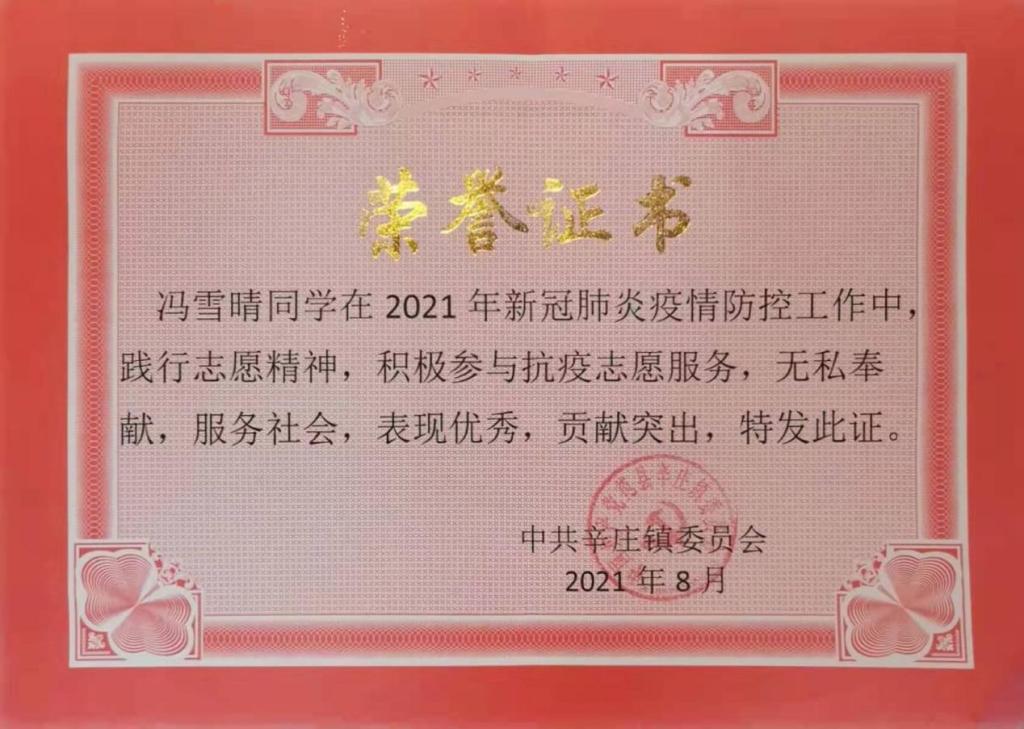青春励志明大德,奉献自我担大任。冯雪晴积极参加社会公益服务活动,大二上半学年参加了“信阳市交通志愿服务活动”,帮助维持交通秩序,荣获“优秀志愿者”称号。2021年8月与2022年1月,在家乡参与了“抗击疫情志愿服务活动”,严格落实疫情防控政策要求,在青春岁月里,在社会实践中回馈社会,奉献自我。