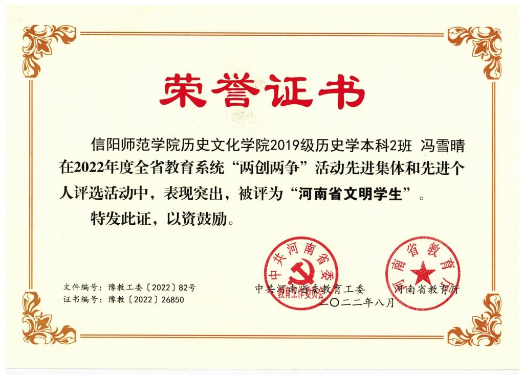 近日,中共河南省委教育工委、河南省教育厅关于开展2022年度“两创两争”活动先进个人评选活动结果揭晓。我院优秀学子2019级历史学二班冯雪晴获河南省“文明学生”荣誉称号。
