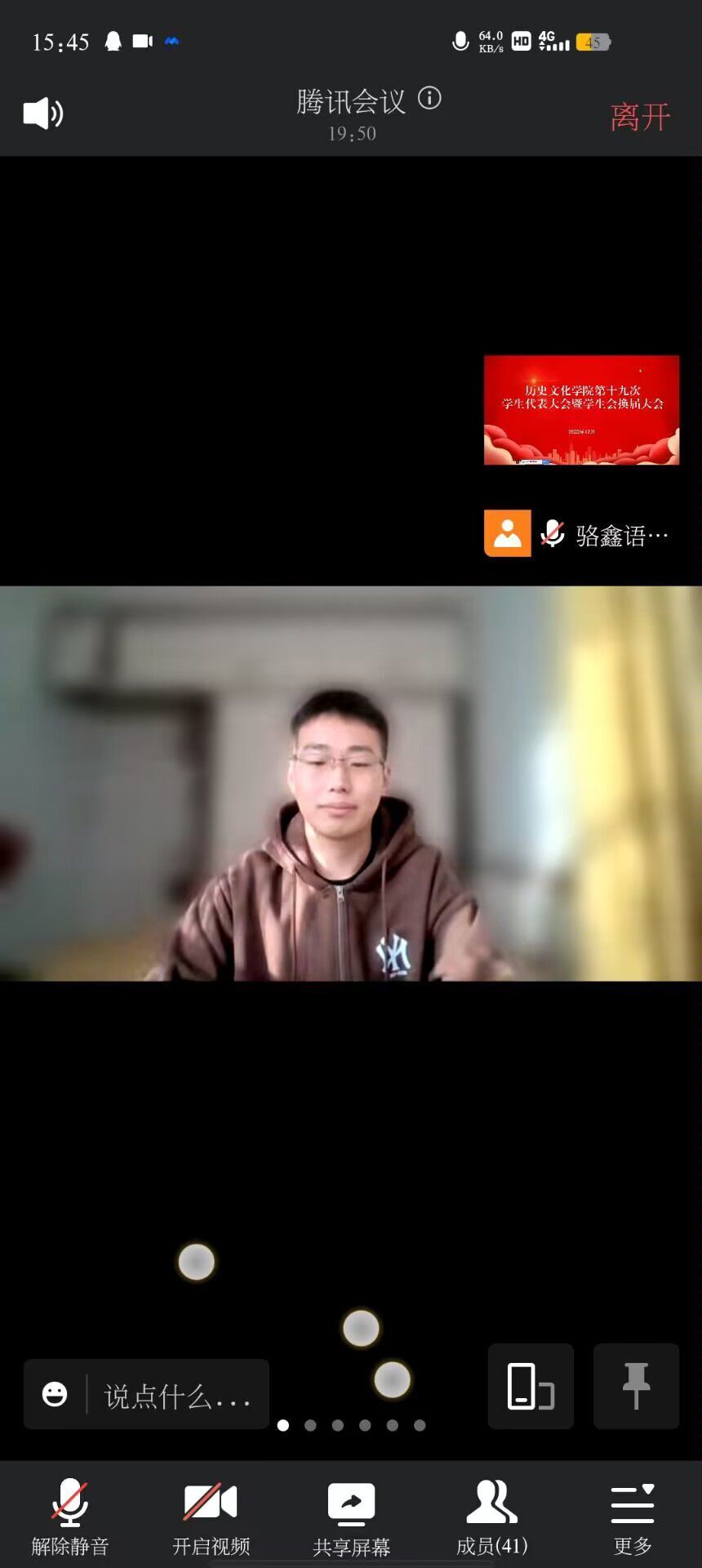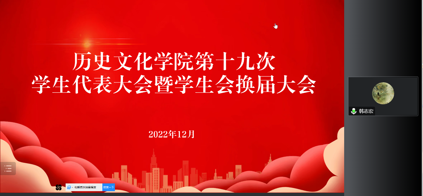 12月14日下午,我院于腾讯会议召开第十九次学生代表大会暨学生会换届大会,学院党委副书记韩志宏,团委老师付亚男、吴慧娟、邓皓,学生会候选人员和学生代表共同参会。