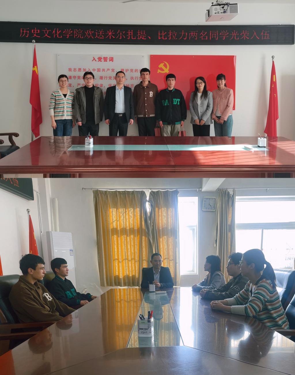 3月14日下午,太阳成集团122ccvip举行欢送2022级学生米尔扎提、比拉力光荣入伍仪式,学院党委副书记韩志宏、辅导员班主任吴慧娟、付亚男、邓皓、邹维一参会。