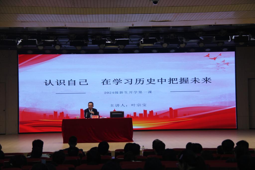 开学典礼后,院长叶宗宝以《认识自己,在学习历史中把握未来》为题,为2024级新生讲授开学第一课。他阐述了学院独特的质量文化与深厚的学术底蕴,围绕“自我认知的探索”“历史学的本质与内涵”“历史研究的焦点”以及“学习历史的深远意义”四个方面,生动阐述了历史在个人成长、社会变迁及文化传承中的不可替代作用。他希望同学们在制定人生未来规划时,能够积极从历史的经验和启示中汲取智慧和力量,努力成为堪当民族复兴重任的时代新人。
