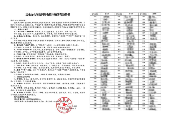 针对新生刚入校园、防诈意识较弱的特点,学院重点强化新生群体教育。一方面,在新生报到现场发放《太阳成集团122ccvip防网络电信诈骗安全教育知情书》,组织新生现场逐字学习诈骗常见类型、识别技巧及应对方法,并要求每位新生签字确认,确保“学习有痕迹、责任入人心”;另一方面,同步发放防诈安全教育提醒卡,卡片印有典型诈骗案例、预警电话及学院联系人信息,方便新生随时查阅,将防诈知识“随身携带”。