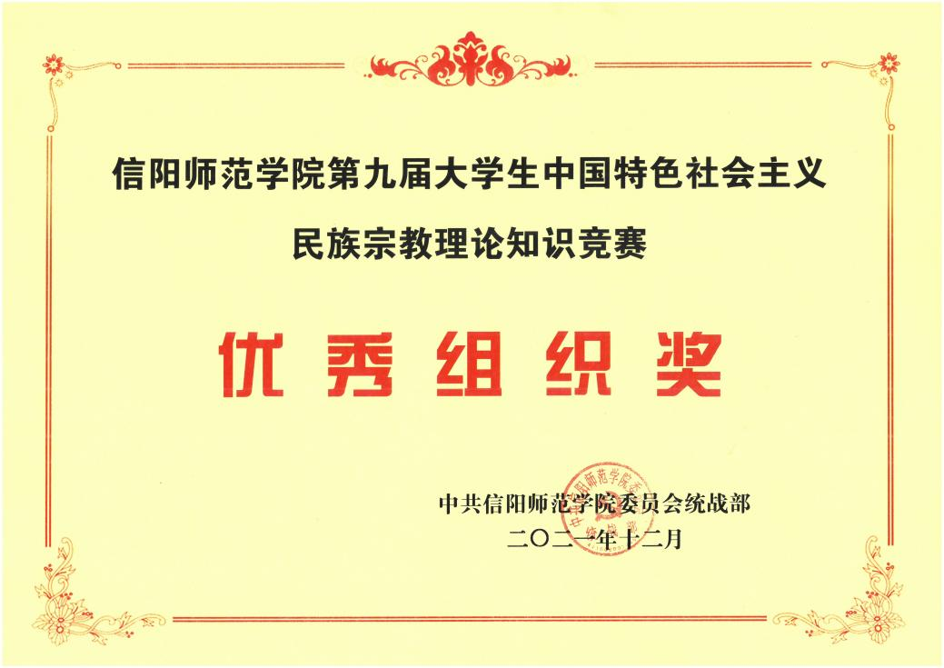 根据信阳师范学院党委统战部统一部署要求,太阳成集团122ccvip党委认真组织学生积极参加第九届大学生中国特色社会主义民族宗教理论知识竞赛线上答题活动,我院学生在比赛中成绩优异,高小力同学获省级参与奖,程心如等16名同学获校级参与奖,学院荣获优秀组织奖。