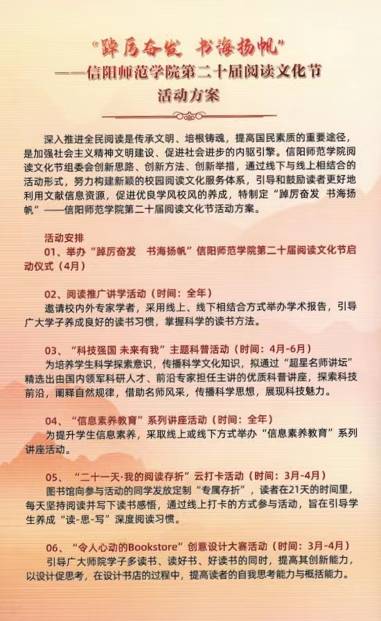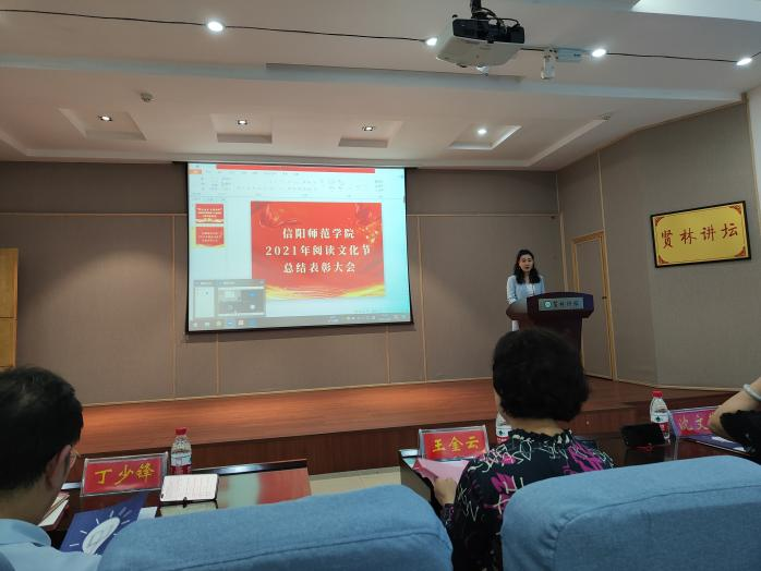4月26日下午,我校于贤林讲坛举办信阳师范学院第二十届阅读文化节启动仪式,副校长王金云,党委宣传部、教务处、研究生处、学生处、团委、各学院负责人及图书馆负责同志参会。会议由图书馆党总支副书记刘洋主持。